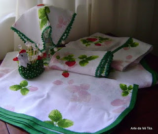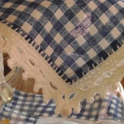 Ganhei uma "tira " de etamine de uma amiga, que tentou fazer sei lá o que e não conseguiu. O tecido era um L. Medindo aqui, virando ali fiz um BEM BOLADO, para minha cozinha. A toalha retangular para mesa redonda tem 70 cm x 50 e a toalha do fogão 50 x 40 cm. Cortei as 2 toalhinhas, costurei um viés, deixando uma barra de 5 cm, que desfiei depois.Este trabalho de desfiar, fiz muito em saco alvejado(saudades...)