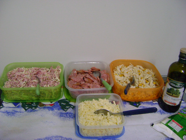 Deixar crescer, modelar, assar em forno quente até dourar. Preparo a massa de manhã e a noite é só rechear e assar por 5 a 8 minutos.NA PIZZARIA DA VOVÓ VOCE MONTA A PIZZA COM OS INGREDIENTES DE SUA PREFERÊNCIA.Presunto e Mussarela- Calabresa - Frango com milho e só mussarela.Para acompanhar requeijão e óleo de oliva.Sai cada uma...guardo um pouco da massa e no outro dia corto uns discos menores faço as esfirras abertas grandes. Na noite da Pizza fiz uma "esfira amostra" para foto.Uma festa!