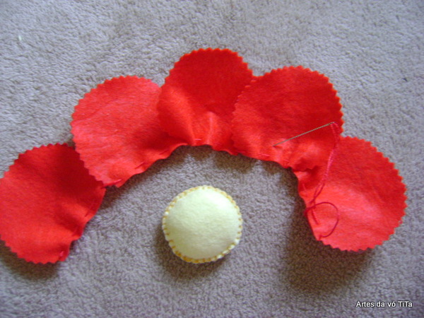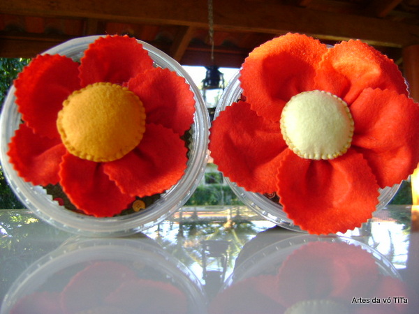 Estas duas fiz com flor de feltro.Um círculo amarelo com manta acrílica e as pétalas (fuxico).