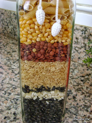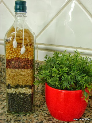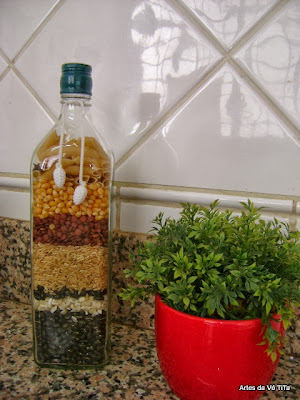 Com a ajuda de um funil,distribui os grãos na garrafa.A última camada espalhei macarrão .Um cordão de nylon (com pecinhas de bijuteria) deu o acabamento final.