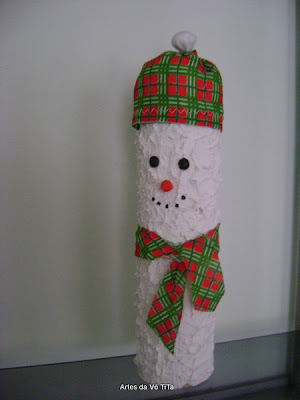 Um tubo de papelão,cobri com massa corrida,nariz e olhinhos de massinha de modelar,boquinha  tinta tecido.Retalhos de tecido natalino deram o toque final.