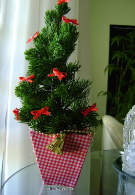 Um pequeno galho desta árvore de natal do nosso jardim (não sei o nome) fitinhas de cetim, vasinho de mdf, forrado com tecido, um sino dourado que tenho há muito tempo, colei no vasinho com cola quente.