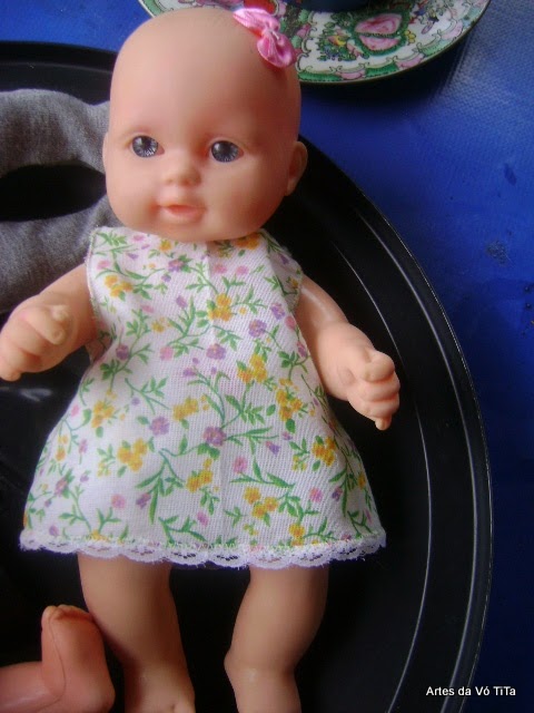 O que mais gostei foi desta bonequinha na cestinha.O macacão fiz de malha e o acabamento e o gorro com uma meia de criança.