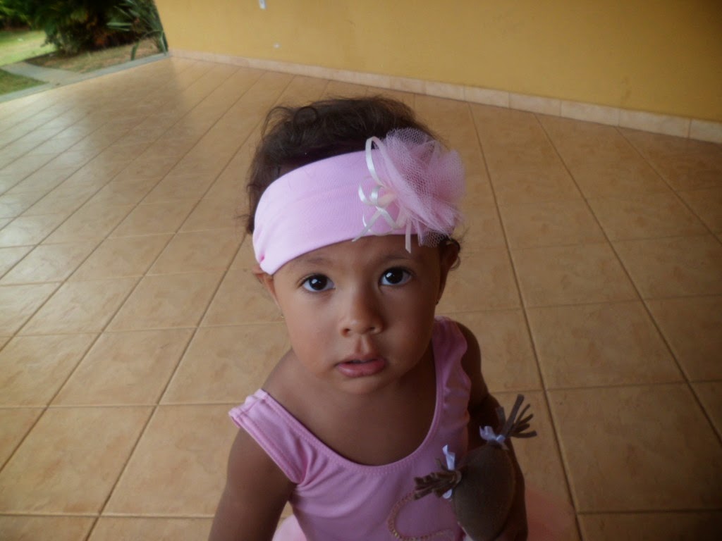 Segui as dicas da Helena e para completar fiz a faixa de cabelo customizada, o collant colei com cola branca a letra S (fio de lantejoulas, comprei 25 cm).A faixa de cabelo colei a flor de tule franzido e fitinhas de cetim.