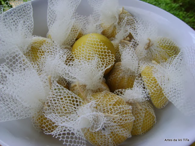 Enrolo as bandas do limão no tule e amarro