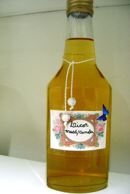 Este vai para minha irmã que gosta de licor. Coloquei uma etiqueta que fiz no word e uma borboleta de cetim para dar um charme.Amarrei um cordão com duas contas.( fazer a calda na mesma quantidade da aguardente com a maça coada) , filtrar . Esperar esfriar e engarrafar. Aguardar 15 dias e saborear essa delícia!