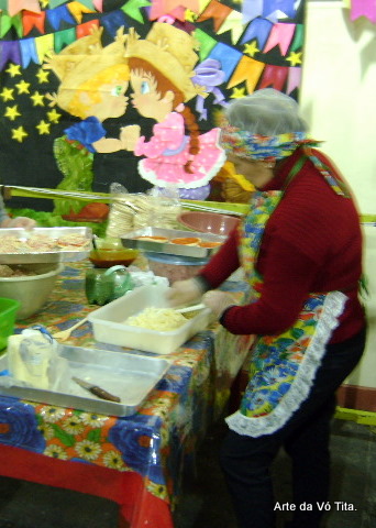 Estamos participando da quermesse da nossa Comunidade. A coordenadora me ligou quarta feira a noite e  pediu para eu fazer " aventais uniformes" para as 9 participantes (inclusive eu) da festa que começaria na quinta à noite(?). Como trabalhamos 3 por noite, fiz a conta do tempo e aceitei.Na manhã seguinte ela me trouxe chita, tule ( rede para o cabelo) e panos de prato. Lá fui eu ! Terminei ontem a tarde o ultimo dos 9 kits que eu chamei "kit feito às pressas ".