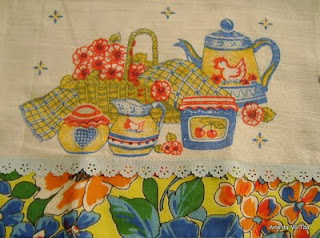O pano de prato do 1,99, bem colorido, costurei uma barra de chita e arrematei com bordado inglês prensado ( que acho muito bom para as peças de cozinha).