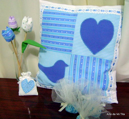 Almofada sempre que faço pego carona AQUI. Como li na net o azul claro e o azul-celeste nos fazem sentir calmos e protegidos de todo o alvoroço das atividades do dia. Também é aconselhável contra a insônia.Nada melhor que estas peças na cor AZUL, para o quarto da querida Kaka. Vou amar fazer mais peças e contribuir para que tudo seja Azul, e achar uma razão para participar do Sábado Azul, da Tina do Sonhar e Realizar.Beijos